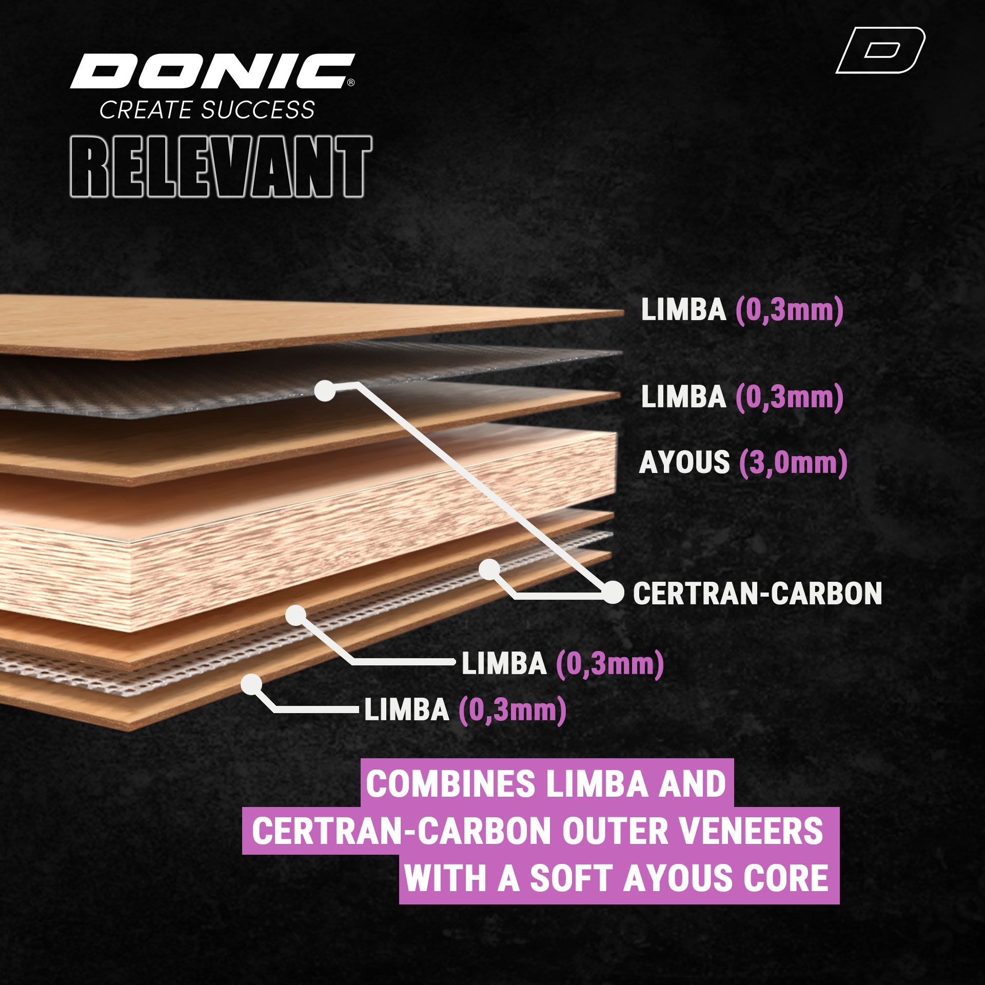 Un bois de Chine, le pays des champions du Monde. Le bois DONIC RELEVANT doit sa dynamique grâce au certran, une fibre synthétique intégrée. Elle est notamment utilisée pour le câble du treuil, lors du départ d’un planeur ou pour les lignes de pêche car elle est 15 fois plus résistante que l’acier. Pourtant, elle transmet au bois RELEVANT très équilibré, des vibrations agréables et aucunement gênantes et un très bon retour de balle. Un bois offensif modéré à un prix modéré.